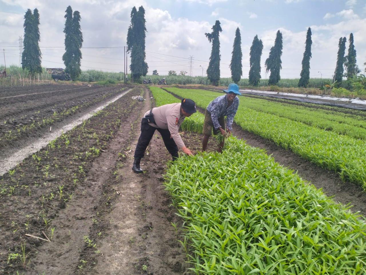 Polresta Sidoarjo melalui Bhabinkamtibmas Polsek Wonoayu Desa Gamping giat pemeliharaan tanaman kangkung untuk ketahanan pangan di Kab. Sidoarjo, Jawa Timur.