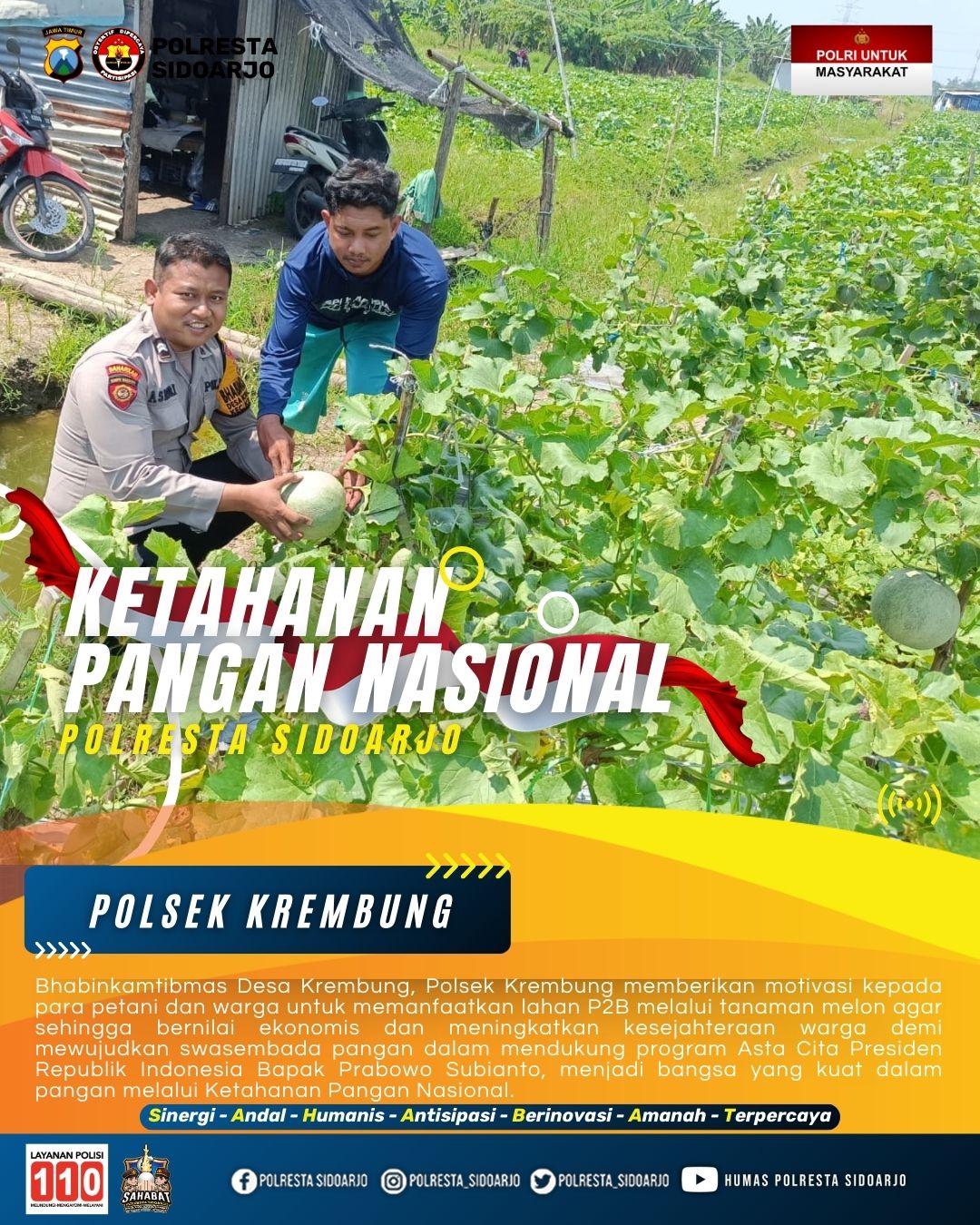 Bhabinkamtibmas Polsek Krembung Polresta Sidoarjo, motivasi petani Desa Krembung dukung ketahanan pangan nasional di Sidoarjo, Jawa Timur melalui lahan tanaman melon